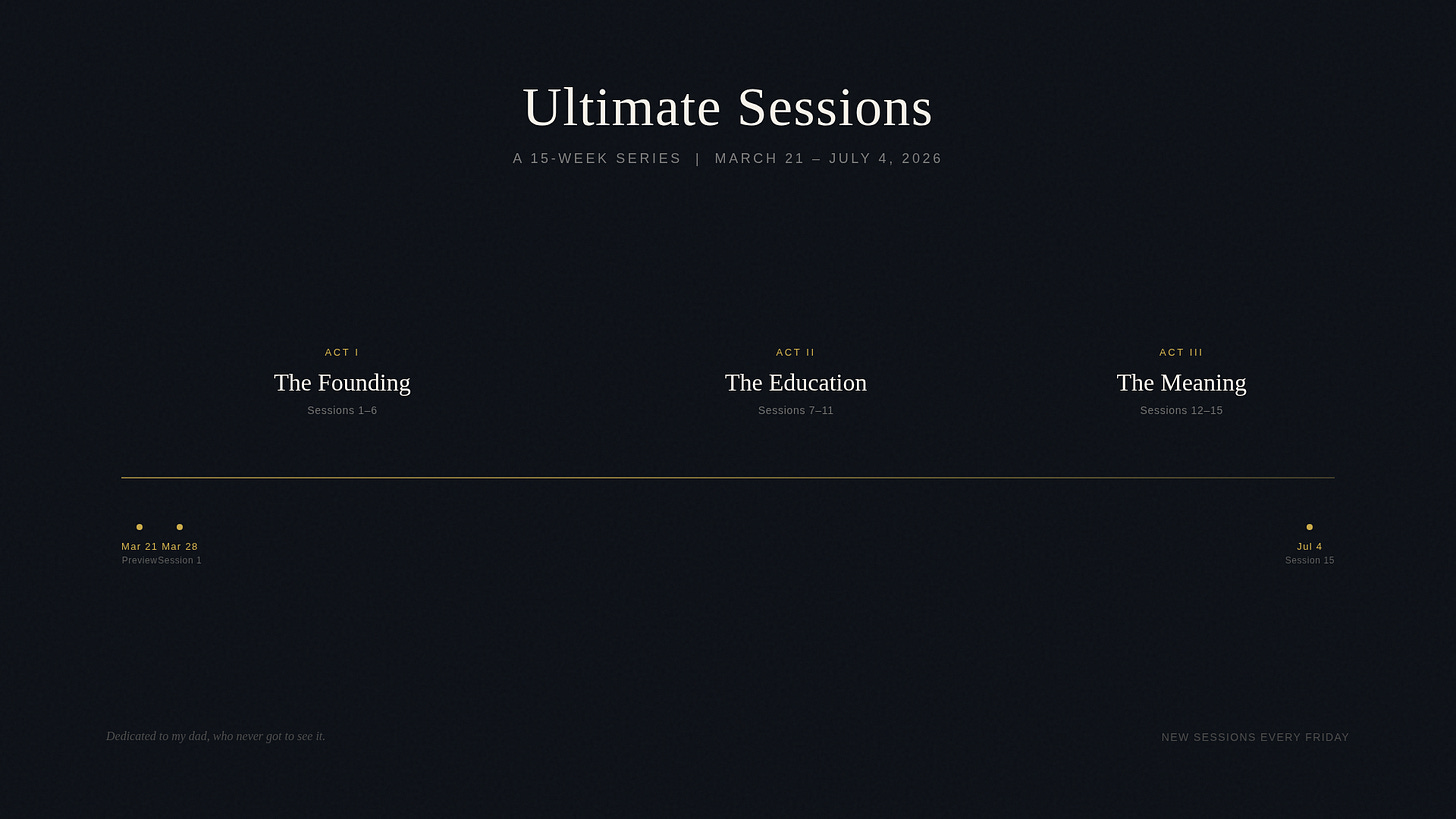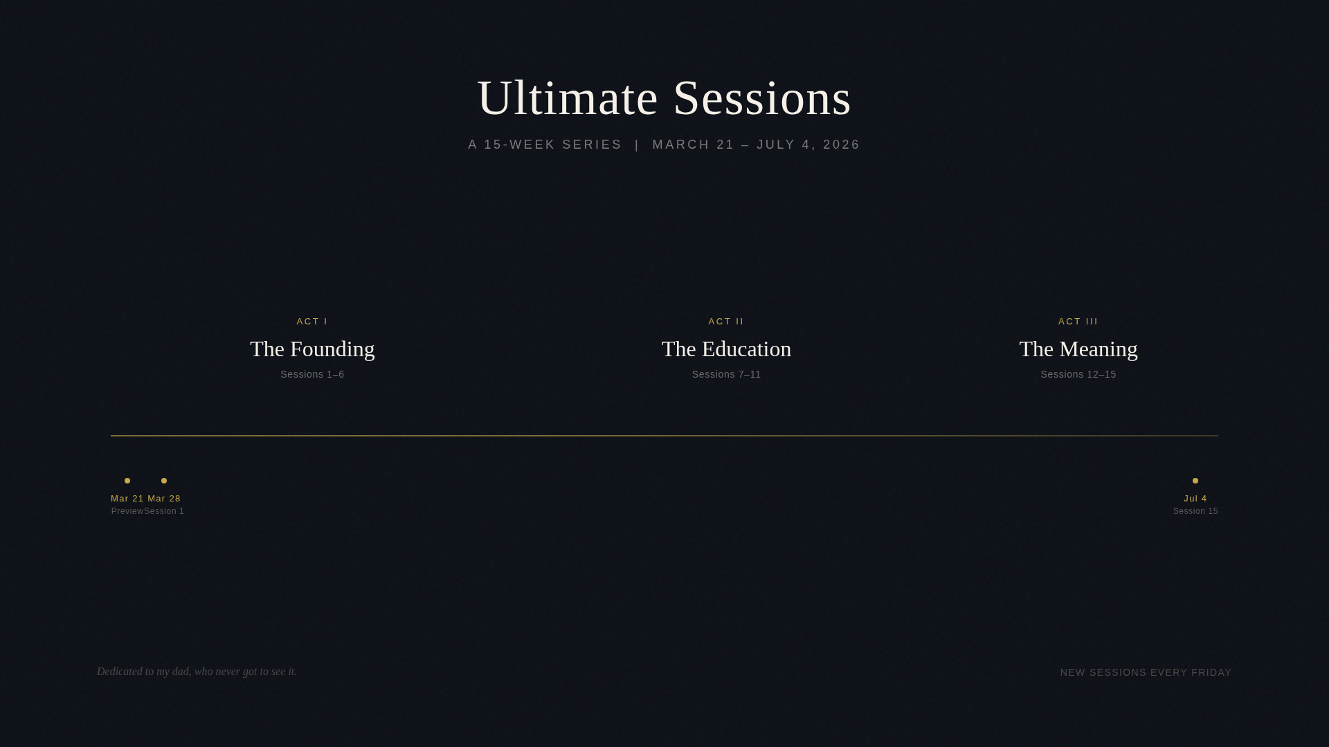 Sessions is a fifteen-part series, published weekly, beginning March 28, 2026, exactly twenty years to the day the first Ultimate Hoops games tipped off. Each installment is built like a track on an album: one story, one truth, one song chosen for the feel of the moment. Hit play on the Suggested Listening, then read. Or read in silence.